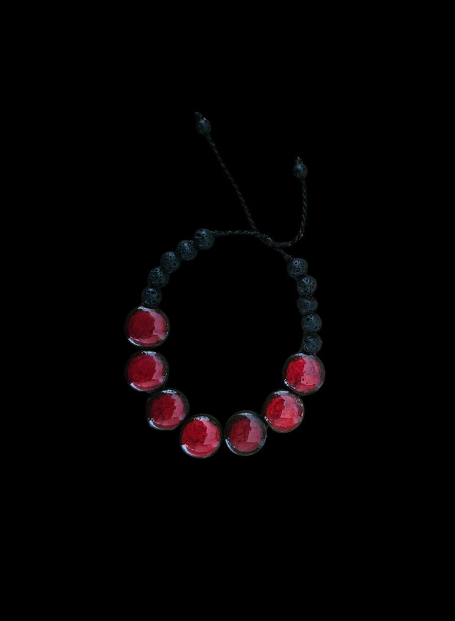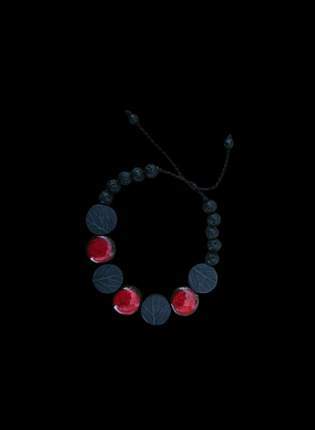 Découvrez ce bracelet composé de perles en porcelaine noire, dont la profondeur est rehaussée par un émail brillant aux nuances chaudes du rouge.