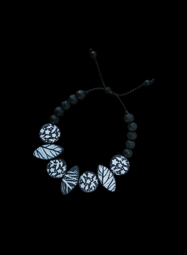 Chaque perle est une œuvre miniature. Façonnée patiemment par mes mains, elle est ornée d'une délicate empreinte végétale, capturant l'éphémère beauté de la nature dans la matière.