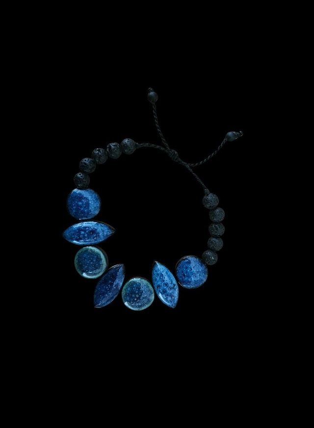 Découvrez ce bracelet composé de perles en porcelaine noire, dont la profondeur est rehaussée par un émail brillant aux nuances bleues et vertes.