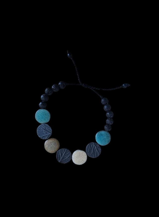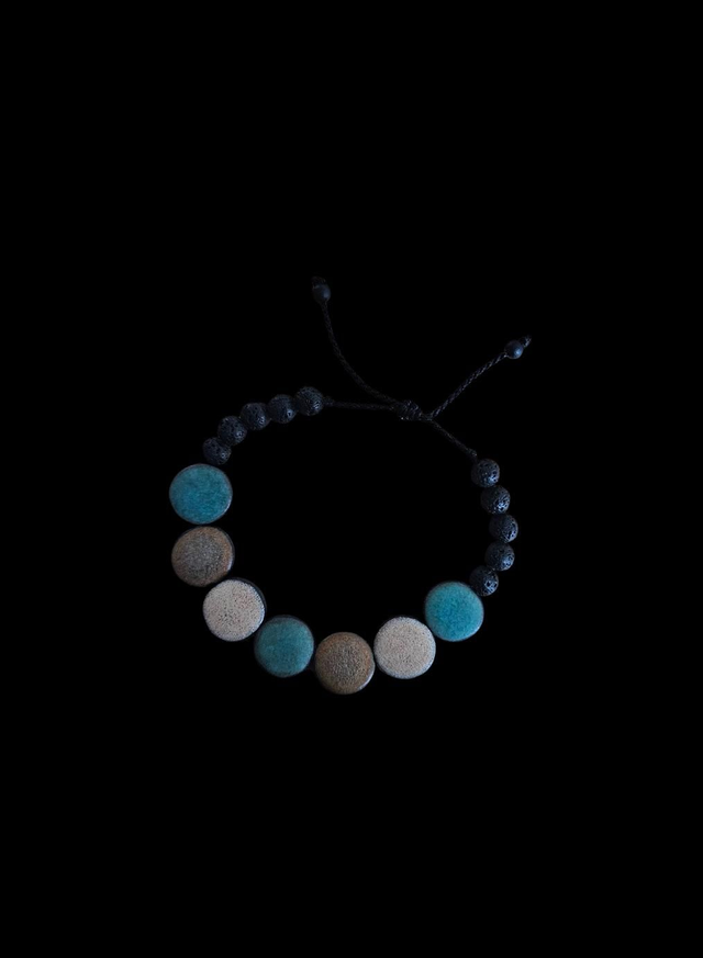 Découvrez ce bracelet composé de perles en porcelaine noire, dont la profondeur est rehaussée par un émail mat aux nuances naturelles, turquoise sable et marron clair.
