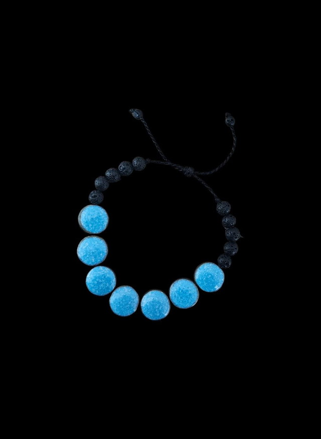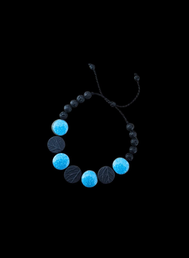 Découvrez ce bracelet composé de perles en porcelaine noire, dont la profondeur est rehaussée par un émail brillant aux nuances bleues claires.